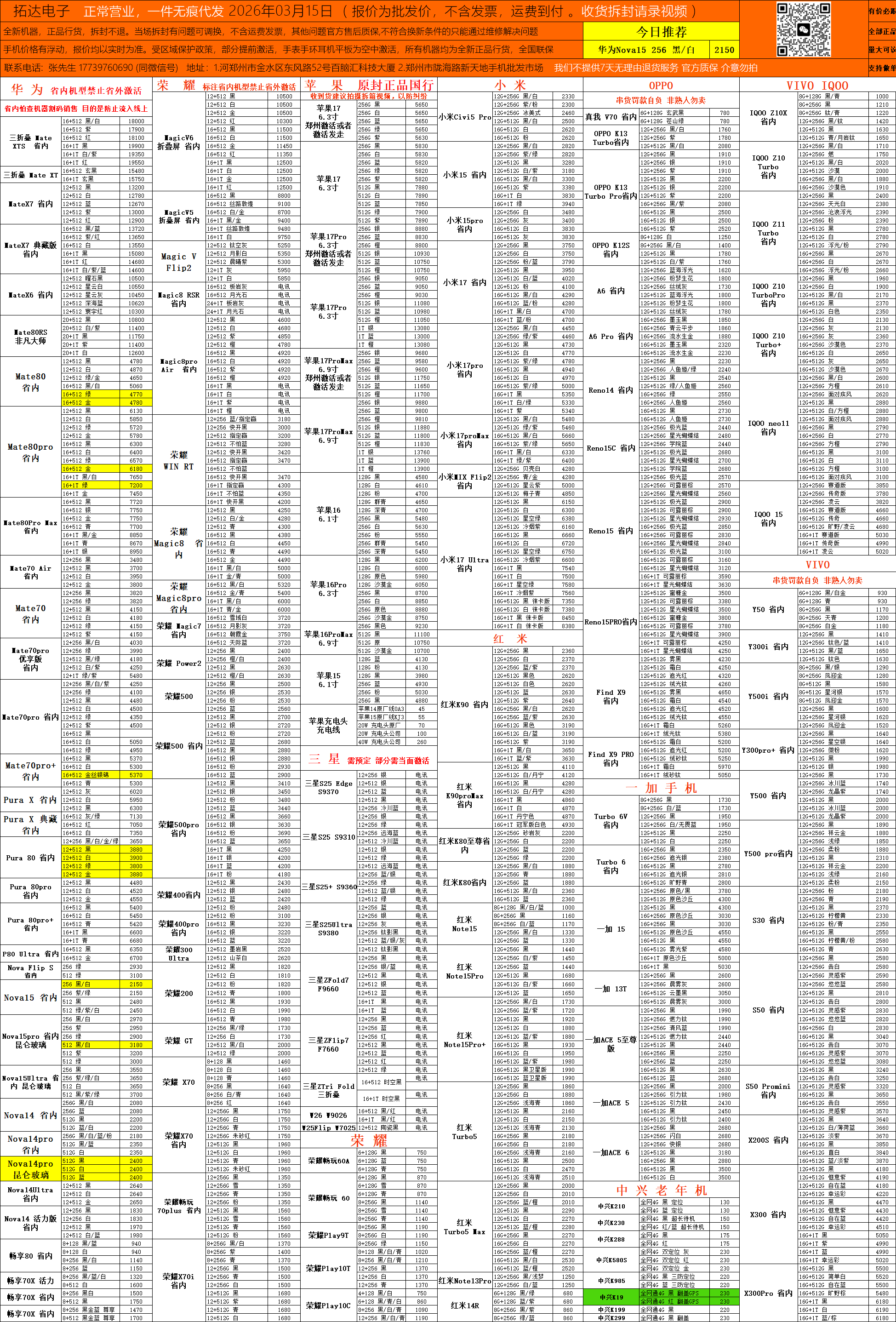 鄭州科技市場(chǎng)手機(jī)批發(fā)報(bào)價(jià)-每日更新(2026-03-15)