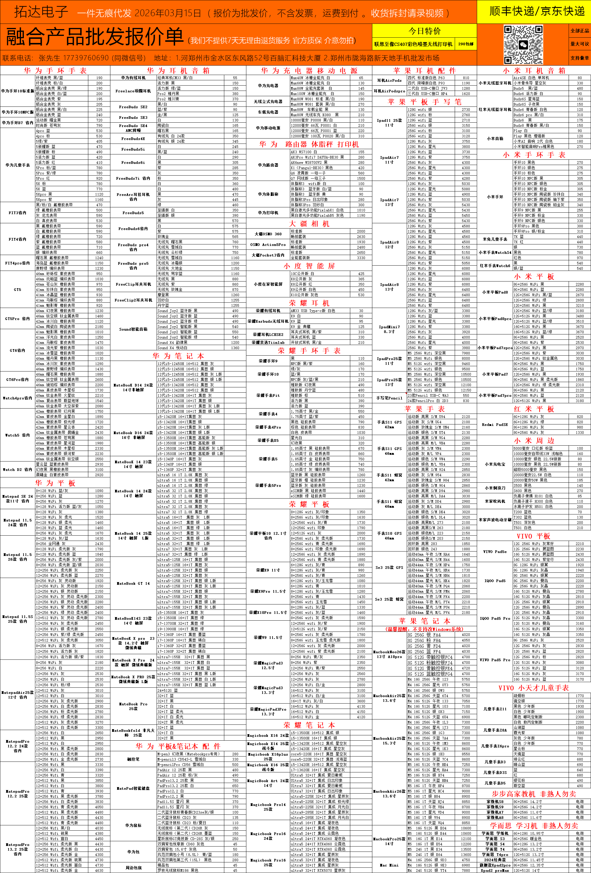 河南鄭州科技市場華為蘋果手表耳機融合批發報價-每日更新(2026-03-15