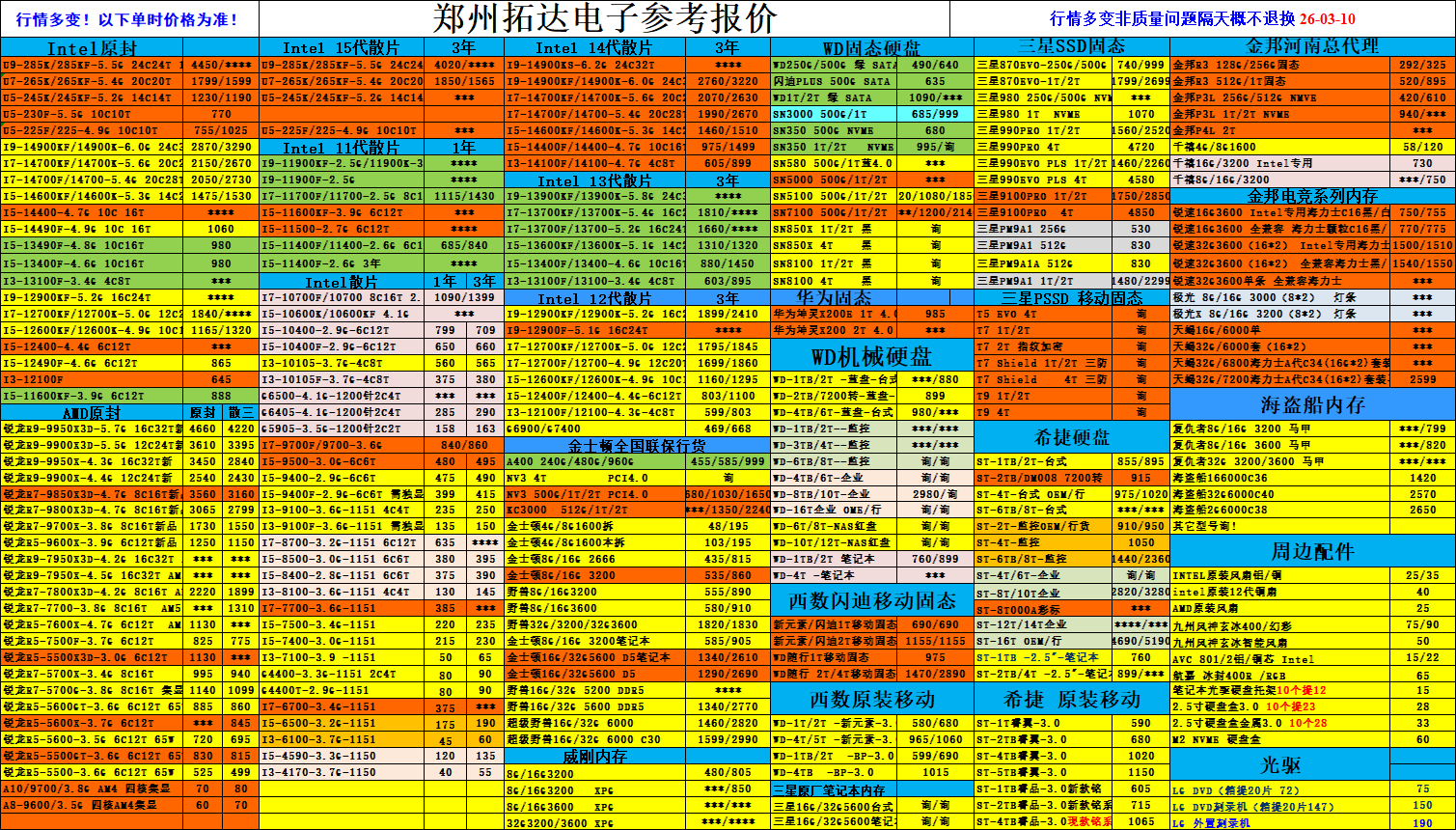 [CPU內存硬盤] 河南鄭州科技市場DIY散件當日報價